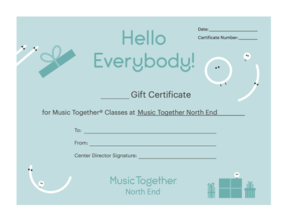Give the gift of Music! Now you can purchase a Music Together® gift certificate for friends and families. Enter the amount you'd like for the gift to be, and after you purchase we'll send you a customized gift certificate via email for you to share. The gift certificate can be redeemed at anytime.